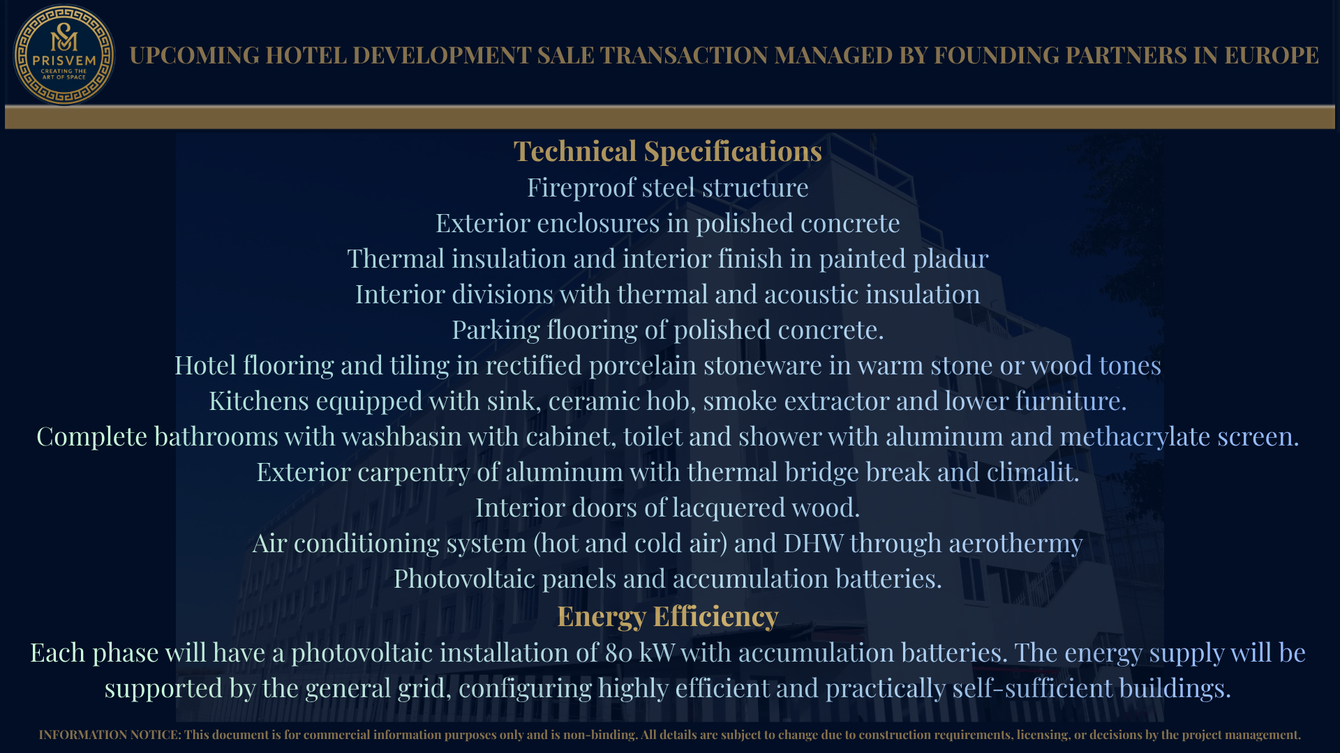 This opportunity relates to the sale transaction of an upcoming hotel development in Madrid, with commercialization and sales management conducted by the founding partners in Europe. The project represents a future development initiative currently in its pre-construction phase, subject to technical planning, licensing, and the progression of the development process. The role of the founding partners is focused on the strategic and commercial management of the transaction, acting on behalf of the ownership.